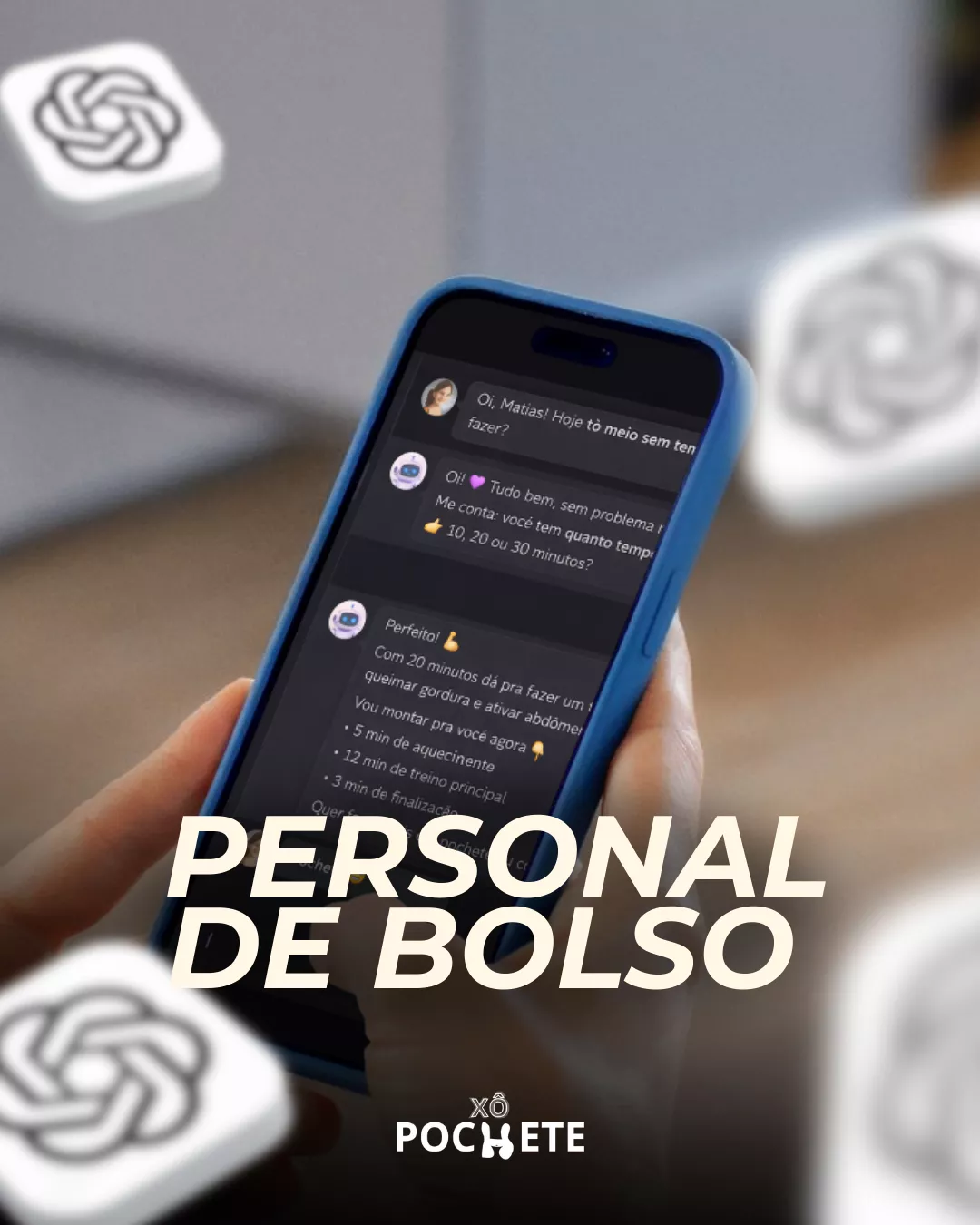 Uma inteligência artificial treinada no método Xô Pochete que cria treinos de acordo com seu nível, tempo disponível e objetivo, pra você nunca ficar sem saber o que fazer.